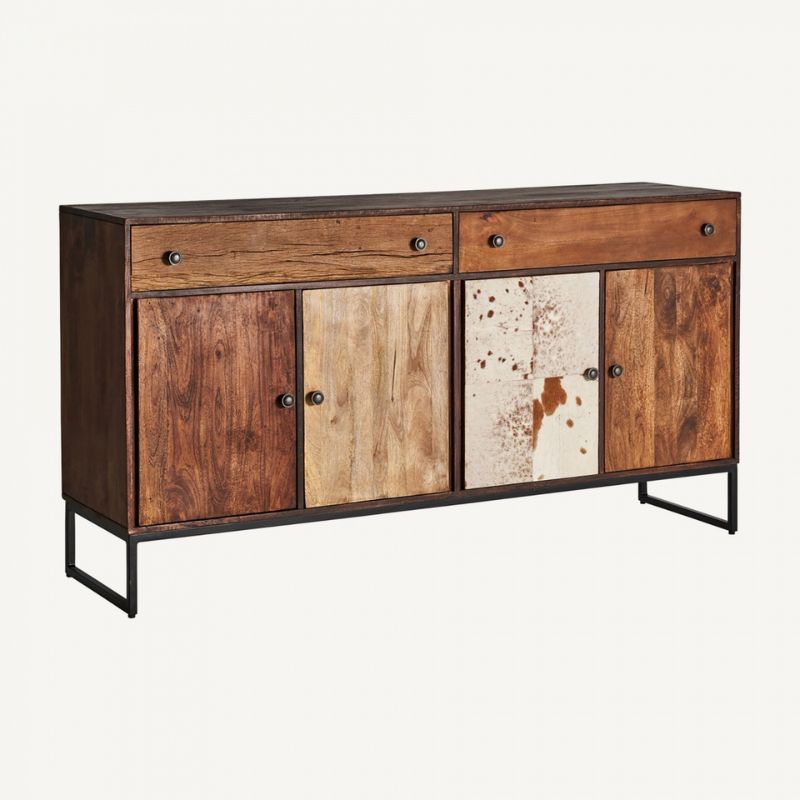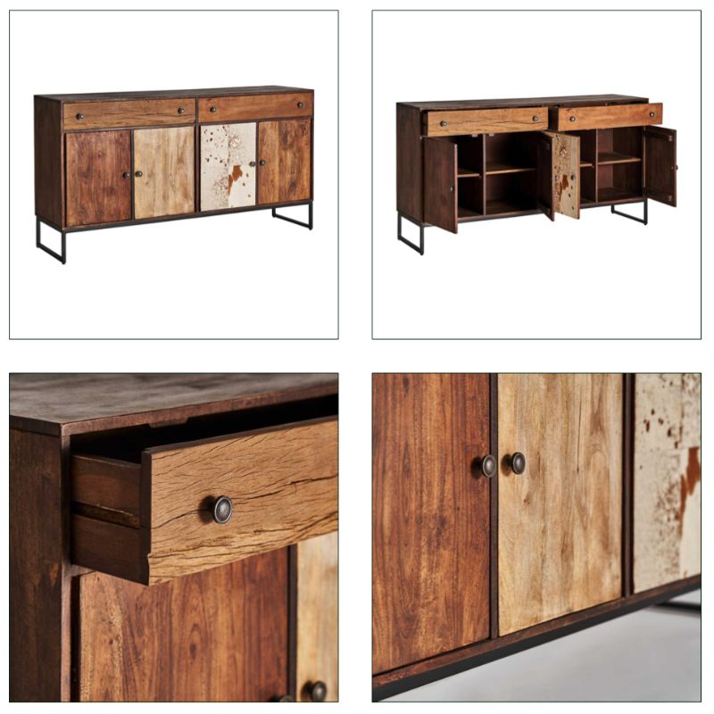 Drewno mango połączone z kowalstwem i skórą bydlęcą. Wymiary (długość x szerokość x wysokość): 172 x 45 x 91 cm. Waga: 68,0 kg. Ilość szuflad: 2 Wymiary wewnętrzne szuflad: 80x34x11 cm. Liczba drzwi: 4 Wymiary wewnętrzne otworu: NA DRZWI 41x43x52 cm. Ilość półek: 4  Wysokość między półkami: 26 cm. Obsługiwana waga półki: 15 kg. Wymiary nóg: 2x2x19 cm. Obwód między nogami: 168 cm. Grubość deski: 1,5 cm. Obsługiwana waga: 70 kg. -Nogi z regulowanymi ćwiekami -Skóra drzwi może zmieniać wzór i ton -Szuflady mają drewniane prowadnice.