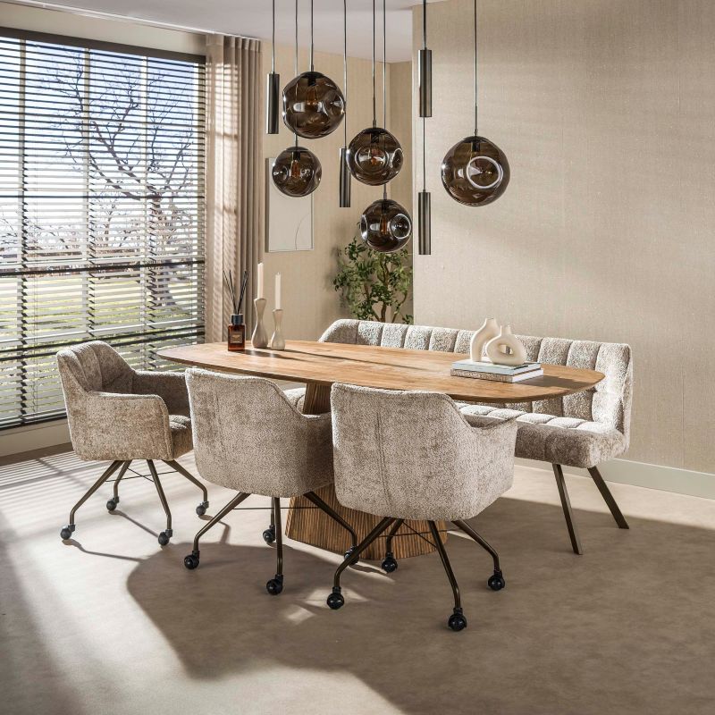 Podnieś standard swojej jadalni lub domowego biura dzięki krzesłu Raster na kółkach. Ten wyjątkowy mebel od Mooi Living to idealne połączenie luksusowego komfortu siedzenia z nowoczesną funkcjonalnością. Wykonane z wysokiej jakości melanżowej tkaniny w ciepłym odcieniu brązu. Krzesło Raster wprowadza do wnętrza przytulność i ponadczasową elegancję.