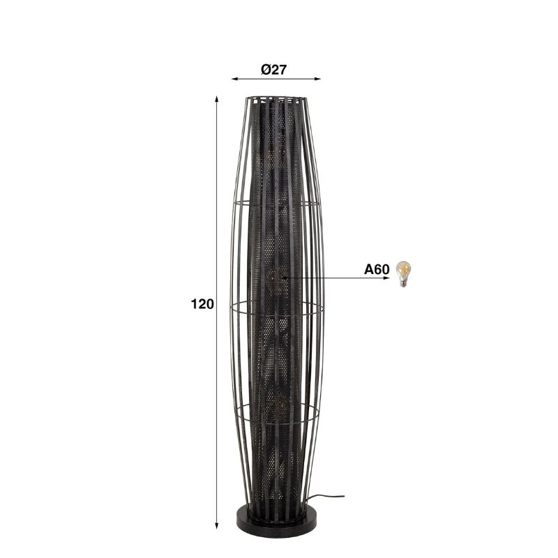 Lampa podłogowa w kształcie cylindrycznej siatki jest wykonana z metalu o wykończeniu w kolorze grafitowym/węglowym. Siatka zapewnia piękne rozproszenie światła. Lampa otoczona jest prętami, co tworzy stylową i ponadczasową lampę! Lampa ta występuje również w większej wersji z czterema światłami. Zalecane jest stosowanie źródła światła LED o numerze sku: 846439A.