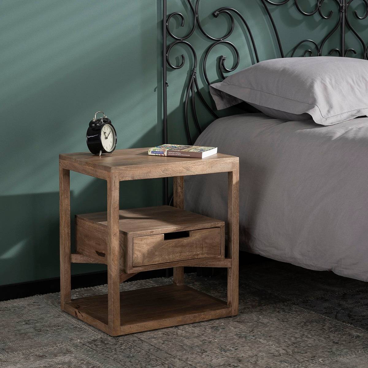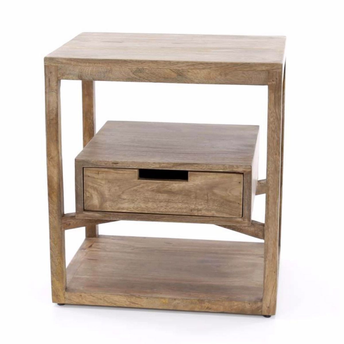 Szafka nocna wykonana została z drewna mango w kolorze piasku. Szafka posiada jedną szufladę, osadzoną na krzyżowej ramie po środku szafki, dzięki czemu wygląda jakby lekko unosiła się w powietrzu. Ta szafka może również służyć jako stolik i jest częścią naszej serii SAHARA.