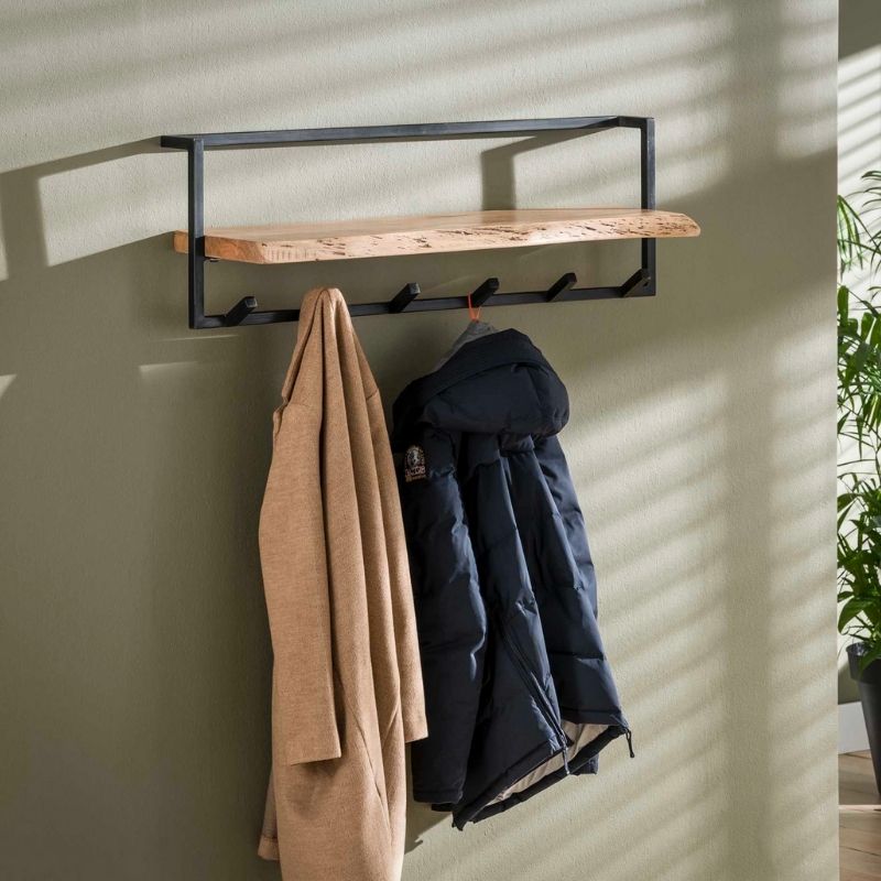 Metalowa rama mocowana do ściany posiada 6 solidnych haków na które zawiesimy nasze okrycie. Półka z tyłu ma otwory w metalu na mocowanie jej do ściany.