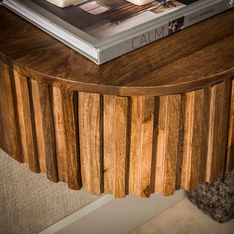 Stolik Ridge został wykonany z wysokiej jakości drewna mango, cenionego za swoją trwałość i piękne usłojenie. Unikalne piaskowe wykończenie nadaje mu surowego, a jednocześnie przytulnego charakteru, który doskonale wpisuje się w style boho, skandynawski oraz nowoczesny.