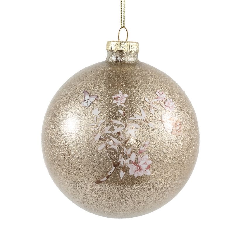 Złote bombki Babs to przepięknie mieniące się ozdoby choinkowe. Bombki malowane są w białe kwiaty. Ozdoby przepiękne udekorują świąteczne stroiki, stoły czy choinki. Złota ozdoba świąteczna Babs dostępna jest w dwóch rozmiarach.