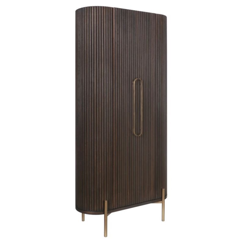 Wysoka komoda Luxor to nowa propozycja holenderskiej marki Richmond Interiors. Blat komody jest drewniany. Wsparta na złotych, smukłych nóżkach. Lamelowe drzwiczki robią wrażenie.