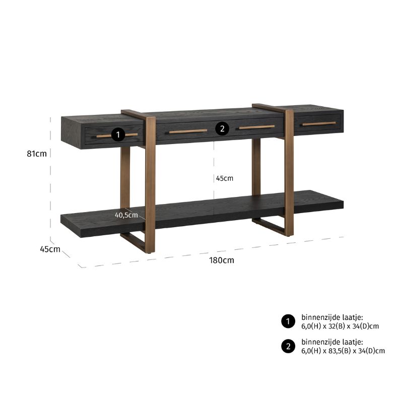 Ekskluzywna konsola Cambon to wytworny i funkcjonalny mebel, który nada każdemu wnętrzu elegancji. Konsola została wykonana z wysokiej jakości materiałów z należytą precyzją. Ponadczasowe połączenie dębowego forniru w kolorze czerni oraz stonowanego metalu. Regał doskonale wkomponuje się we wnętrze w stylu zarówno klasycznym jak i art deco.