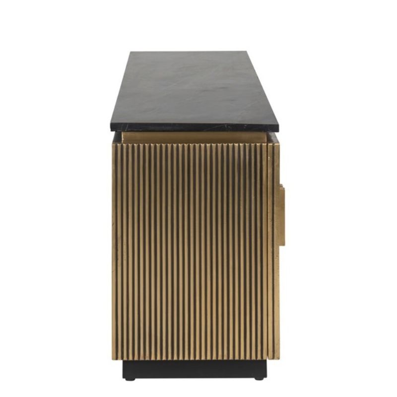 Ekskluzywna szafka RTV Ironville to wytworny i funkcjonalny mebel, który nada każdemu wnętrzu elegancji. Komoda została wykonana z wysokiej jakości materiałów. Blat szafki został wykonany z czarnego marmuru, fronty z MDF. Szafka RTV doskonale wkomponuje się we wnętrzu w stylu zarówno klasycznym, glamour, art deco.