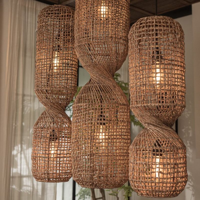 Dostępne w trzech rozmiarach S, M i L. Lampy wiszące Twister Koi są ukształtowane w kształcie „pułapki na ryby” przy użyciu metalowej ramy z otwartym dnem i mistrzowsko owinięte korą manili, aby stworzyć rustykalny i przyjemny wygląd splotu. Lampy są następnie ściskane i skręcony, odsłaniający stylowe „skręcone detale” i zwieńczony herbem z ręcznie toczonego drewna tekowego z odzysku. Rzucając piękny, pstrokaty blask na powierzchnie i ściany.