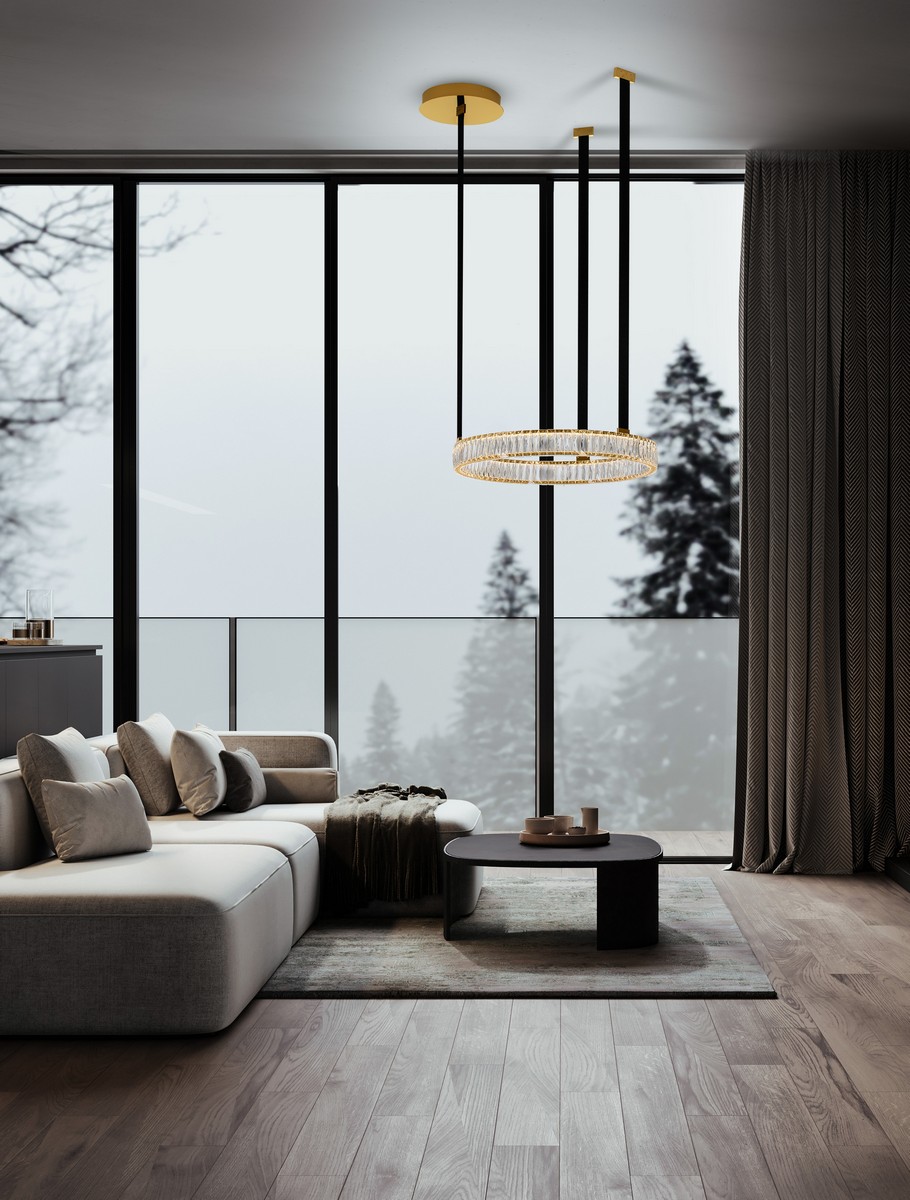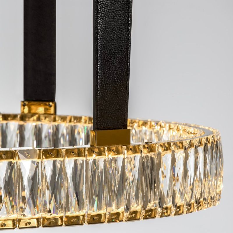 Lampa wisząca Aurion to elegancka oprawa oświetleniowa, która łączy nowoczesny design z wytwornym glamour. Została wykonana z wysokiej jakości materiałów. W tym matowego złotego aluminium, stali, kryształu K9 oraz czarnej skóry, co nadaje jej unikalny, subtelny charakter.