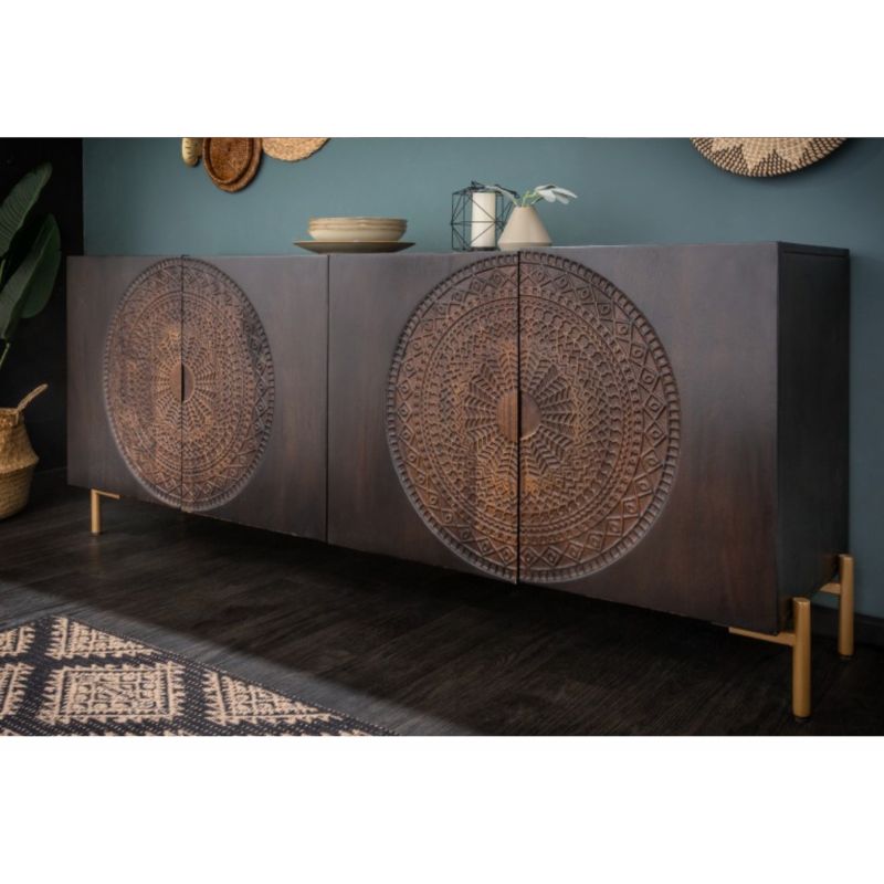 Drzwi są misternie zdobione ornamentami. Rozmiar ok.): 177cm x 76cm x 45cm (SxWxG) Przedziały: 4x 86cm x 27cm x 333cm (SxWxG) Wysokość stopy: 14 cm Materiał: Drewno lite, drewno mango, lakierowane Rama: metalowa Drzwi z zamknięciem magnetycznym Kolor: czarny, złoty